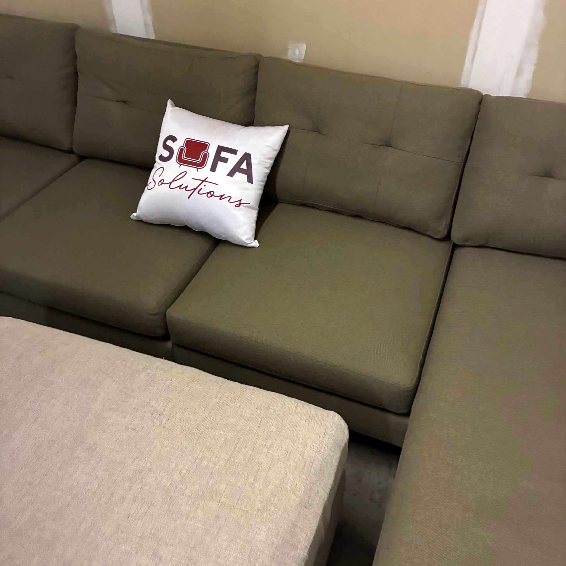 Shown here in a sophisticated olive/taupe green fabric (a versatile neutral with subtle texture that pairs beautifully with contemporary decor), it has a clean mid-century modern silhouette—tufted seat backs, clean lines, and sturdy block legs. The fabric is performance-grade, stain-resistant, and built to handle real life (pets, spills, daily lounging).